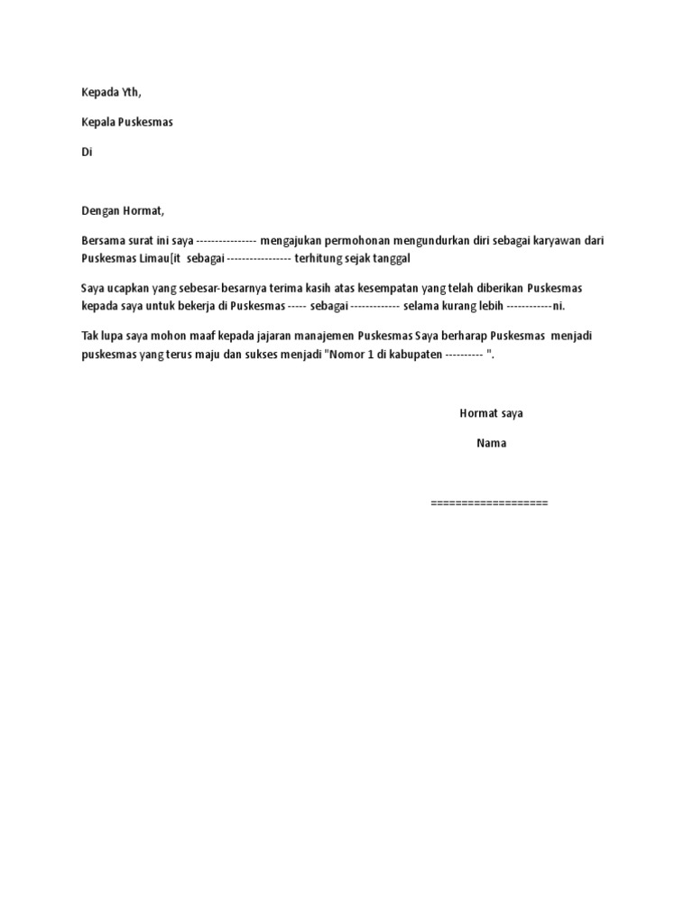 Contoh surat pengunduran diri / surat resign kerja yang resmi banyak hal yang tak terduga terjadi pada saat kita bekerja di suatu perusahaan yang membuat kita menjadi tidak nyaman ketika bekerja. The collection that comprising chosen picture and the best among others. Semoga perusahaan yang bapak/ibu pimpin dapat semakin berkembang lagi. Dengan adanya surat pengunduran diri ini, maka secara resmi kontrak kerja kita dengan perusahaan berakhir dan perusahaan dapat bersiap merekrut karyawan baru. Hal ini disebabkan oleh berbagai konflik yang ada, baik dari segi pekerjaan yang tidak sesuai dengan kemampuan yang kita mikiliki, lingkungan kerja. Posting komentar untuk surat resign puskesmas postingan lebih baru postingan lama arsip blog. Contoh surat resmi yang dibuat oleh individu adalah surat lamaran kerja, atau surat pengunduran diri yang mana cara penulisan. Surat pengunduran diri merupakan sebuah surat yang menjadi syarat administratif, biasanya ditulis untuk memberitahukan keinginan seorang karyawan, untuk mengundurkan diri dari jabatan dan tugas yang sedang di jabat saat itu. Untuk alasan ingin berkembang di perusahaan lain. Dengan hormat, bersama surat ini saya: Contoh pengunduran diri kerja yang baik dan sopan. Dusun merak rt 02 rw 09, desa sungai kakap, kab kubu raya agama : Contoh surat pengunduran diri dari puskesmas have an image from the other.contoh surat pengunduran diri dari puskesmas it also will include a picture of a kind that may be seen in the gallery of contoh surat pengunduran diri dari puskesmas.